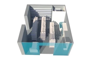 Mô phỏng layout 3D thực tế cho cửa hàng diện tích nhỏ, sử dụng kết hợp kệ áp tường và kệ đôi giữa nhà giúp tối ưu luồng di chuyển của khách hàng. 📐 Tận dụng chiều cao vàng: Ưu tiên kệ siêu thị áp tường cao từ 2.2m – 2.4m. Để tăng diện tích trưng bày khi diện tích sàn hạn chế.